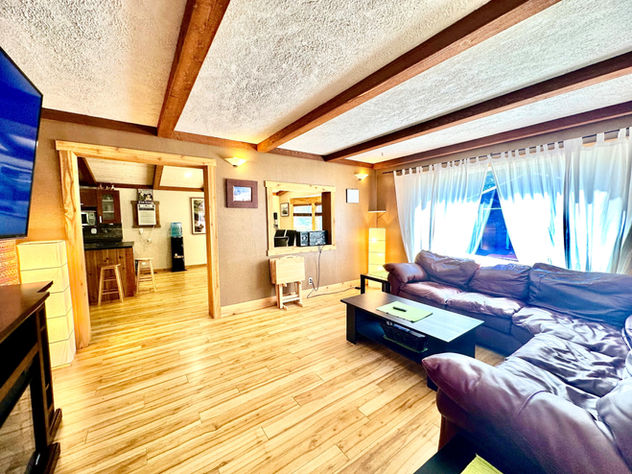 Come inside to a bright, open kitchen and living space. The kitchen is fully equipped with all the necessities of home, offers a sit up island bar and dining area. RELAX and curl up on the couch in front of the wood burning fire place while you watch movies on the 60" Apple TV!